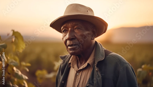 A smiling senior farmer in casual clothing enjoying the sunset generated by AI
