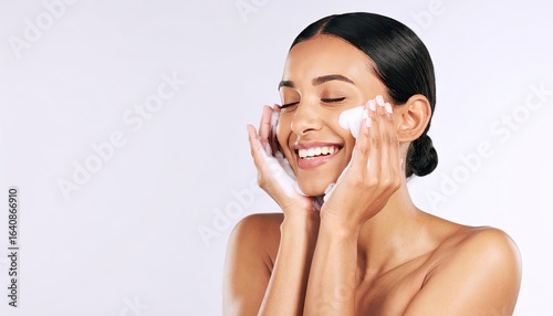 A smiling woman with dark hair pulled back washes her face with white lather, her eyes closed.