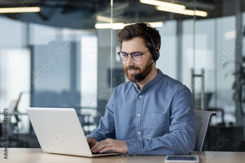 A smiling young man in a blue shirt is sitting at a desk in a modern office, wearing a headset, working and studying at a laptop