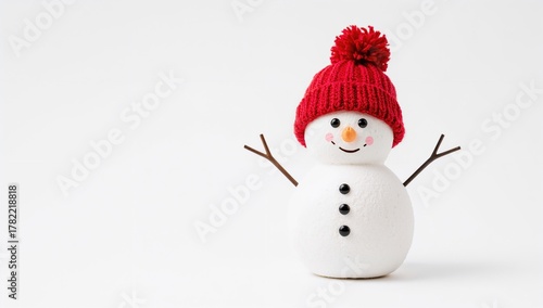 A snowman wearing a red knit cap stands isolated on a white backdrop, seasonal decoration