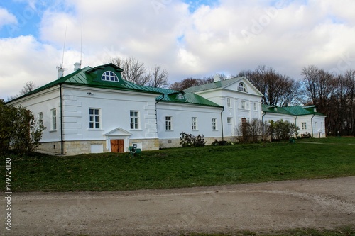 A snow-white house with a green roof in the estate of Count Leo Tolstoy in Yasnaya Polyana in October 2017.
