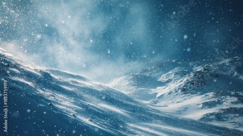 A snowy mountain scene shows slopes covered in fresh snow with snowflakes swirling in the air. The environment feels tranquil and captures the essence of a cold winter day.