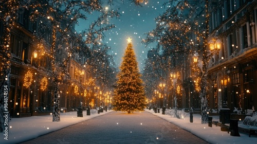 A snowy street lined with glowing holiday lights, with a grand Christmas tree standing tall in the center of the square.