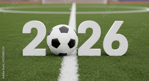 A soccer ball placed on a green field with the numbers 2026 beside it. The scene represents the upcoming soccer events and sports culture.