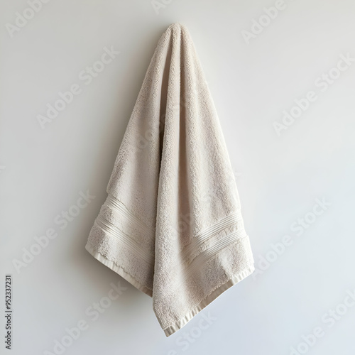 A soft, neutral towel hanging on a clean, minimalistic wall, showcasing elegance and simplicity in everyday items.
