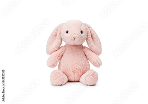 A soft pink plush bunny with long ears sitting upright on a plain white background studio shot