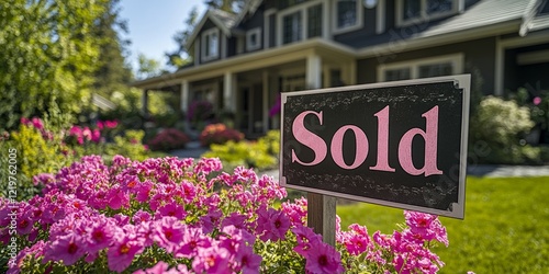 A "Sold" sign in front of a modern home with flowers. Great for real estate, home sales, and property success visuals.