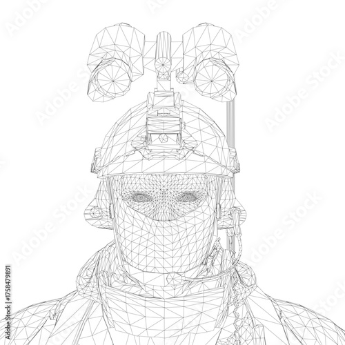 A soldier in full uniform with helmet and goggles depicted as a black and white wireframe model.