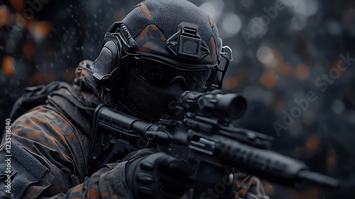 A soldier in tactical gear aims a rifle, showcasing military readiness in a dramatic setting.