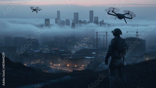 A soldier is standing on a rooftop, looking out over a city. There are two drones in the sky and fog covering the lower parts of the city.