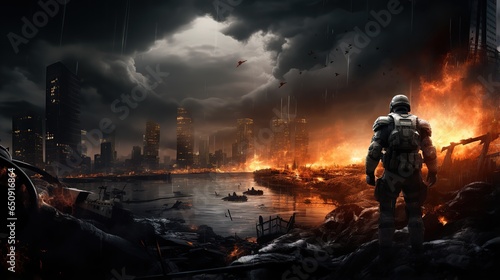 a soldier looks at a fire in the city