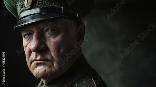 A solemn portrait of an older man in a military uniform, wearing a cap, exuding authority and experience with a stern expression.