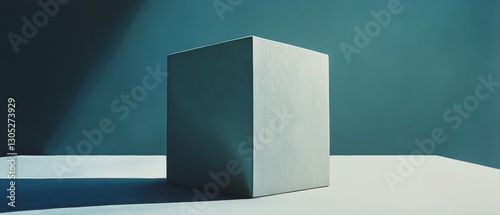 A solitary cube rests in tranquil light, its sharp edges and shadows create a minimalist yet striking composition on the pale surface.