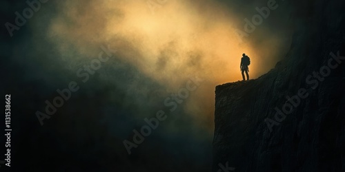 A solitary figure stands at the cliffs edge, enveloped in mist, reflecting on future paths and countless opportunities for personal growth, selfdiscovery, and exploration in life