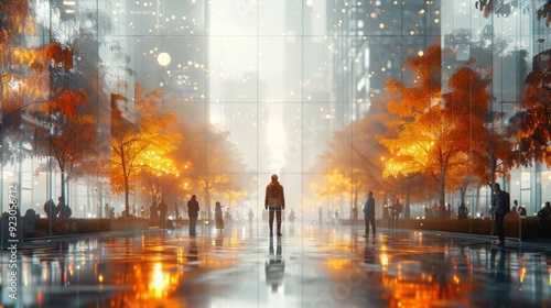 A solitary figure stands under glowing trees in a futuristic cityscape illuminated by soft lights at dusk