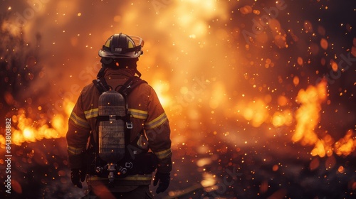 A solitary firefighter stands valiantly facing a fiery blaze, illustrating determination and professionalism
