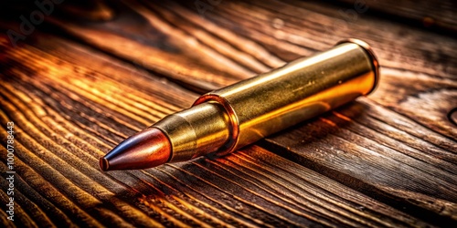 A solitary rifle bullet rests on a wooden surface, illuminated by dramatic lighting that accentuates its gleaming