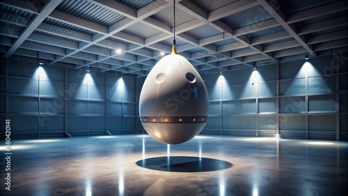 A solitary, sleek, white, egg-shaped spacecraft hangs motionless from the ceiling, illuminated by soft, ambient light in a dimly lit room.