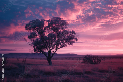 A solitary tree against a vibrant pink and purple sunset, creating a stunning and serene landscape
