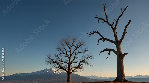 A solitary tree with a unique shape stands out against a bright, clear blue sky and a majestic mountain range, creating a striking and beautiful scene. generative.ai