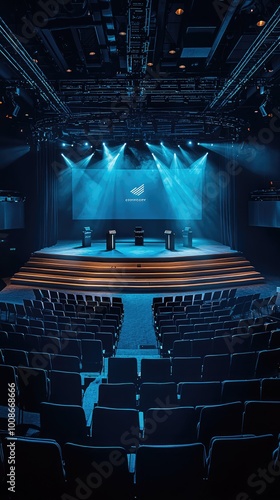 A spacious auditorium with stage lighting set for an event, showcasing empty seats and a modern design ready for a presentation.