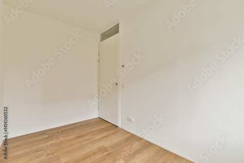 A spacious interior featuring white walls and a wooden floor, radiating a minimalist aesthetic suitable for modern living spaces.