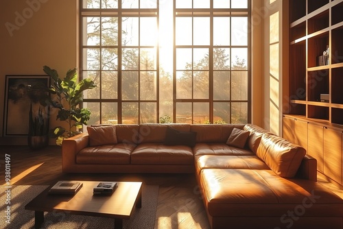 A spacious, modern living room with a large leather sofa, detailed wooden furniture, and a panoramic window letting in a splash of light, casting shadows and leaving ample copy space on the right
