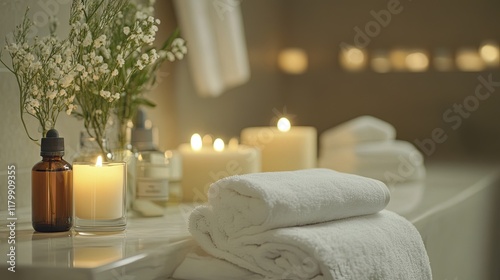 A sparkling bathroom setup with spring-scented candles and essential oils