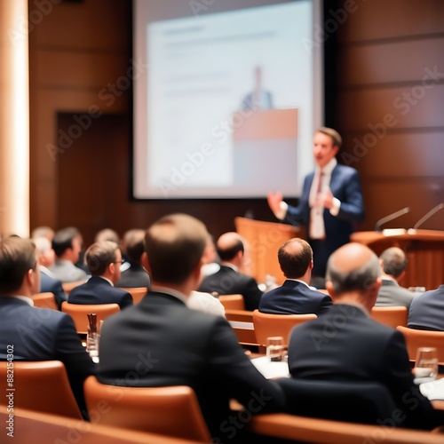 a speaker presenting at conference meeting. blurred focus background with a unidentifiable audience.