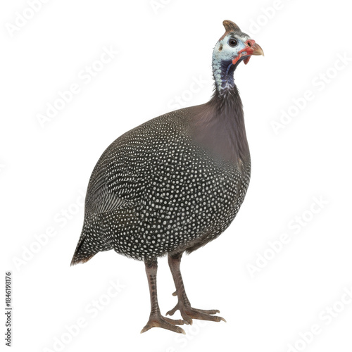 A speckled guinea fowl stands elegantly against a dark backdrop showcasing its unique plumage