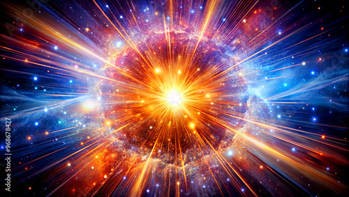 A spectacular cosmic event unfolds, with bright rays of light emanating from a central explosion. Colors blend, creating a mesmerizing display of energy and gas that illustrates cosmic forces at play