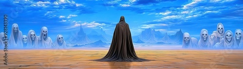 A spectral figure in a flowing cloak, standing alone on a deserted festival ground, with ghostly faces watching from the shadows, Horror, Desaturated Colors, Digital Art