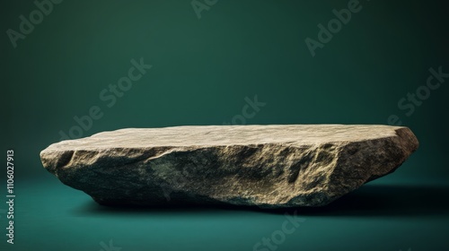 A split boulder podium with a smooth, polished top, resting on uneven ground, on a deep green background