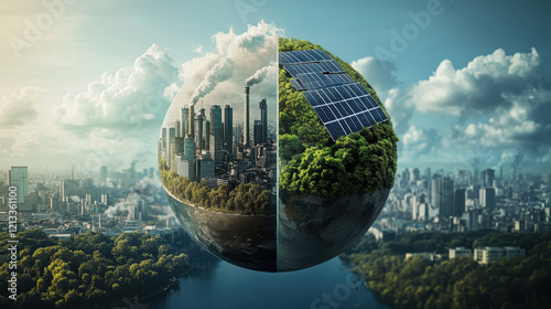 A split Earth globe showing half with industrial pollution and the other side with greenery