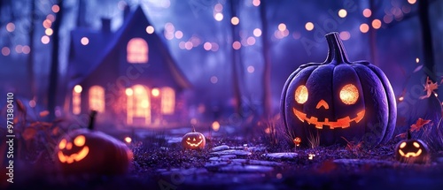 A spooky Halloween scene featuring glowing pumpkins, a charming house, and twinkling lights creating a magical atmosphere.