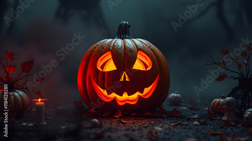 A spooky jack-o'-lantern glowing in the dark with a foggy background, surrounded by scattered autumn leaves and Halloween decorations, space for text. Generative AI