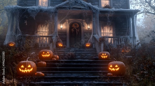 A spooky old house with flickering jack-o-lanterns on the steps and thick cobwebs covering the windows