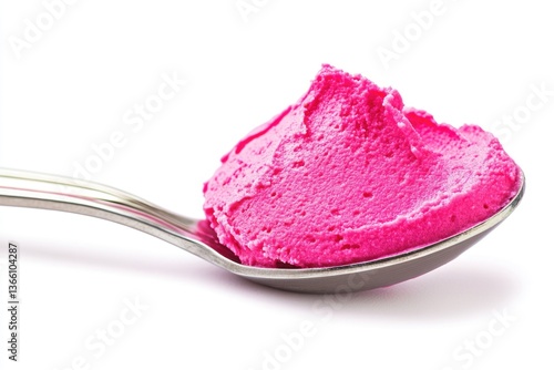 A spoonful of vibrant pink ice cream, smooth and creamy texture, delicious dessert.
