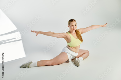 A sporty woman performs a graceful split in a bright studio, showcasing her strength and flexibility.