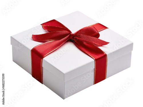 A square white gift box, elegantly wrapped with a red ribbon and bow