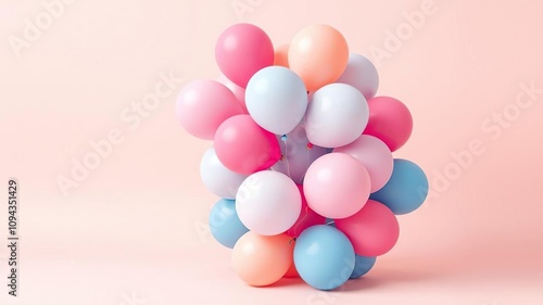 A stack of colorful balloons in shades of pink and blue on a pastel background with a few stray balloons floating above, balloons in shades, colorful balloons, festive atmosphere