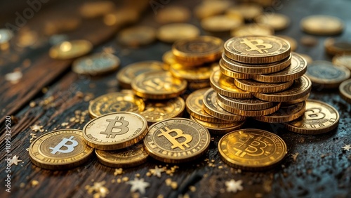 A stack of golden coins on a wooden table, antique look, soft shadows.