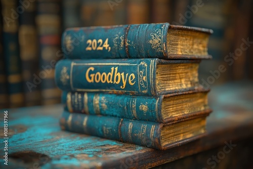A stack of old, worn books with the words "2024" and "Goodbye" on the spines. The books are set on a wooden table with a blurred background of more books.
