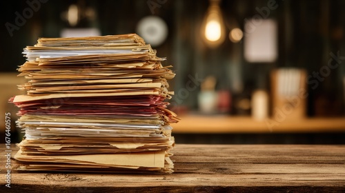 A stack of old, yellowed files on a wooden table in a dimly lit room with a wooden desk and a clock on the wall.