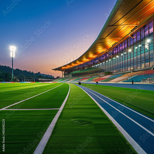 A stadium with a green field and a blue track. The stadium is lit up at night