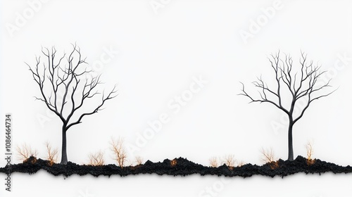 A stark depiction of barren trees and soil, symbolizing desolation.