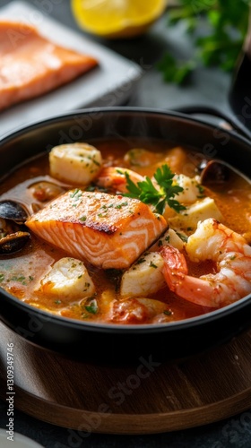 A steaming bowl of bouillabaisse bursts with flavor, featuring succulent fish, tender shrimp, and flavorful shellfish, all adorned with bright green herbs and aromatic spices