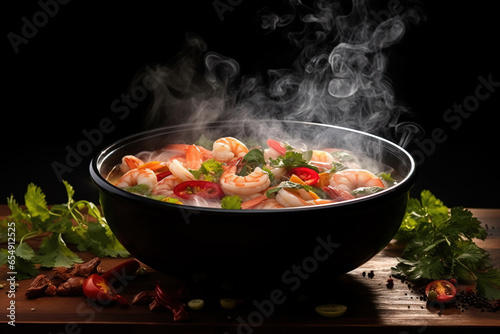 A steaming bowl of Tom Yum Goong, brimming with plump shrimp, aromatic lemongrass, and fiery chili peppers