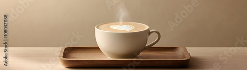 A steaming cup of latte art, crafted with care and presented on a wooden tray, ready for a delightful coffee break.