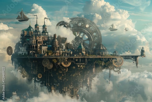 A steampunk city floats among clouds and airships